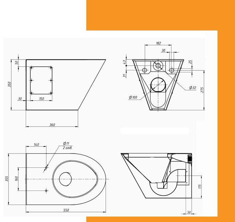 Унитаз выполнен из нержавеющей стали AISI 304. Предназначен для использования в санитарно-бытовых помещениях. ТУ 25.99.11-003-92472221-2017. В комплект входит: 1. Подвесной унитаз; 2. Сиденье для унитаза; 3. Манжет.
